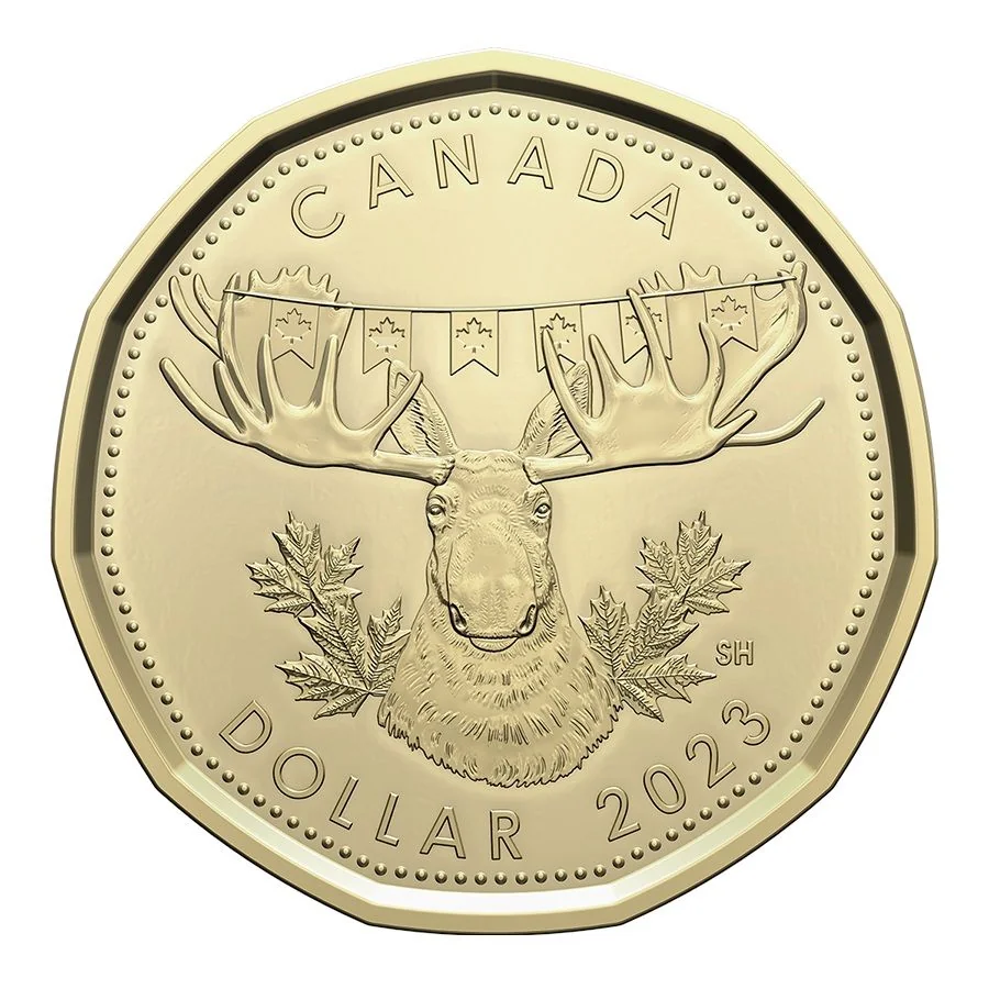 This Canadian dollar coin features a moose with a flag-draped antler, designed by artist Steve Hepburn.