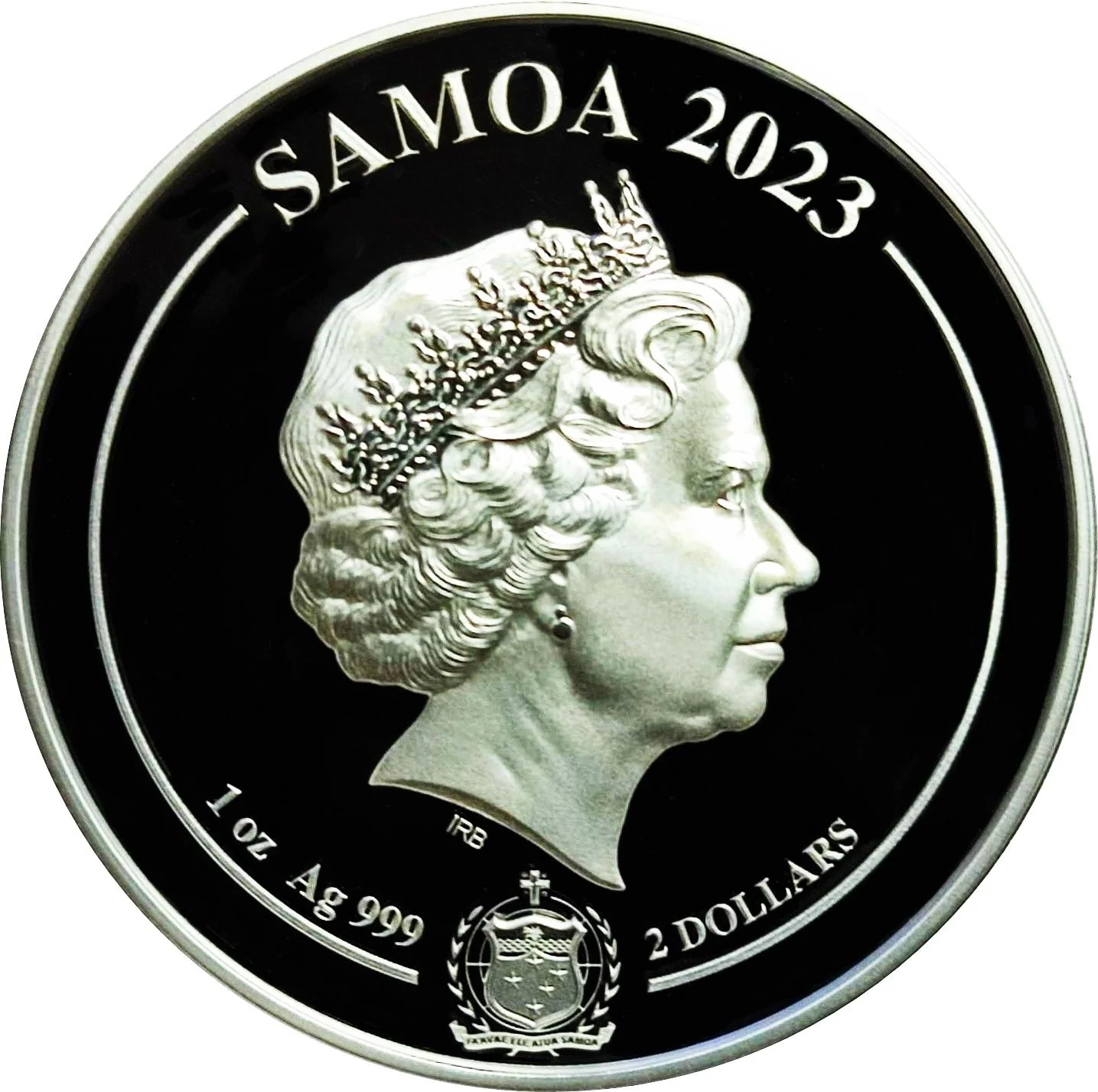 Queen Elizabeth II facing right, Samoan coat of arms below.