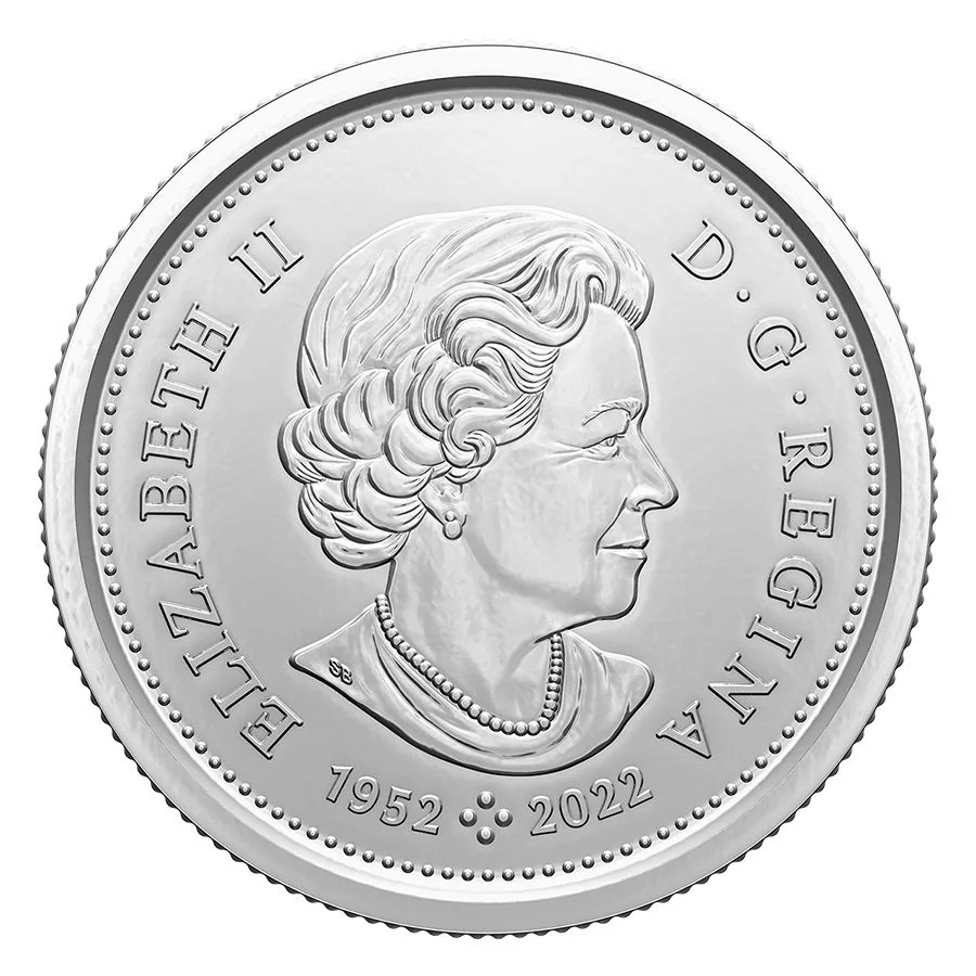 Queen Elizabeth II at 77, facing right, wearing a necklace and earrings. The effigy includes the dates 1952–2022 separated by four pearls, representing her four portraits on Canadian coins.