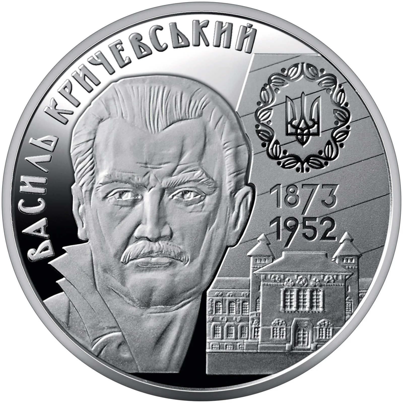 A portrait of Vasyl Krychevsky, with his legacy to the right: the Ukrainian People's Republic coat of arms above the facade of the Poltava Provincial Zemstvo (1903–1908), which he designed. His name appears in a semicircle to the left, and his lifespan (1873–1952) to the right.