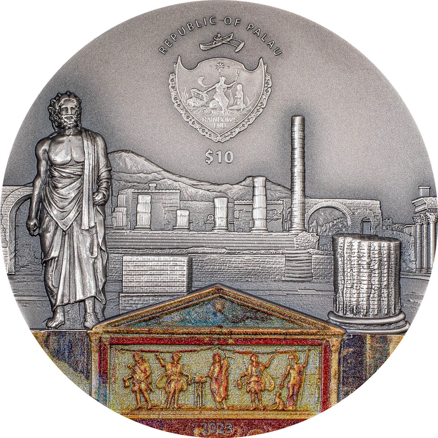Palau's Coat of Arms over Pompeii, with Vesuvius in the background.