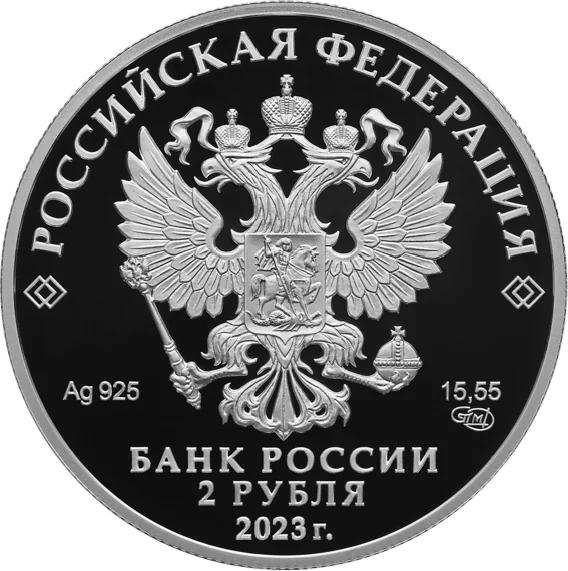 The obverse features the Russian coat of arms, inscriptions "РОССИЙСКАЯ ФЕДЕРАЦИЯ" and "БАНК РОССИИ", the denomination "2 РУБЛЯ", the year 2023, the metal's chemical symbol, fineness, mint mark, and fine metal content.