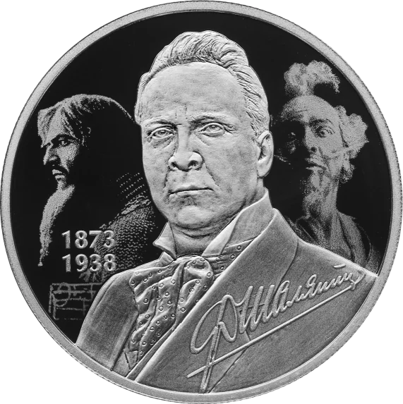 The reverse features a laser-matte relief portrait of Feodor Chaliapin, set before his stage personas and a musical stave. His signature is at lower right, with his birth and death years '1873' and '1938' at left.