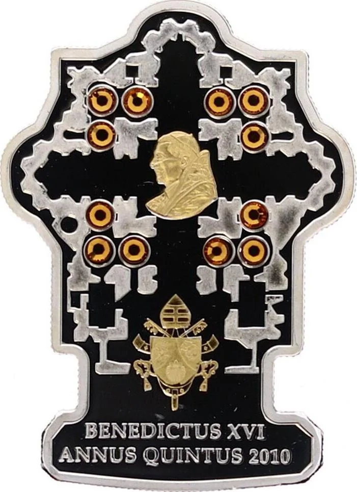 Pope Benedict XVI's portrait centered on a cross, with his coat of arms below.