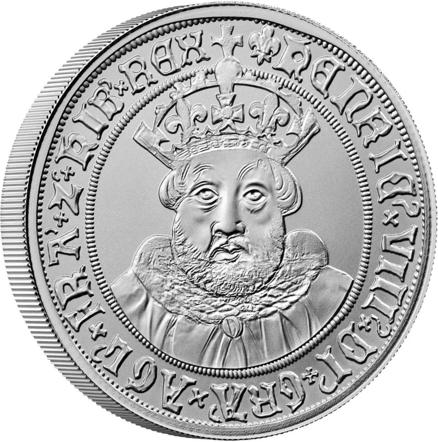Henry VIII crowned portrait in beaded circle, surrounded by legend.
