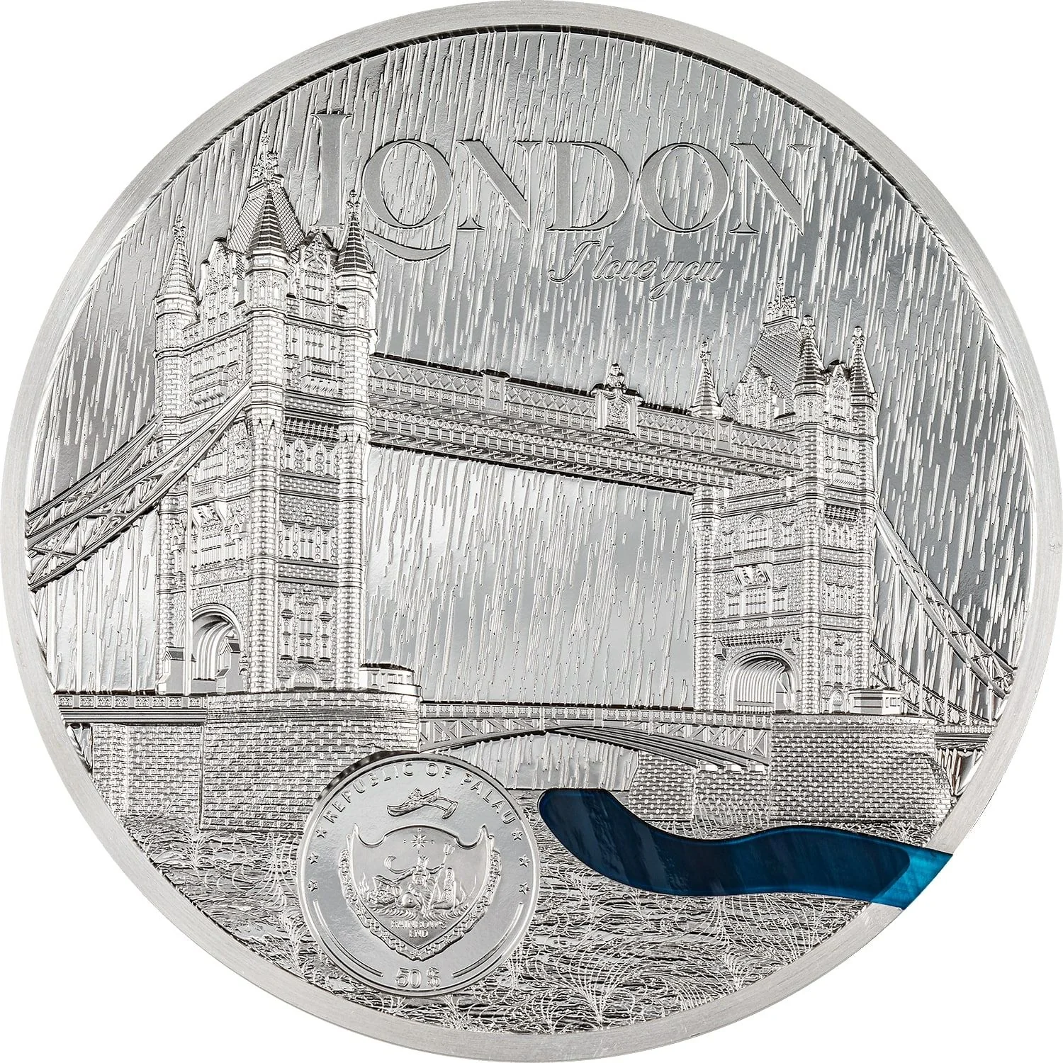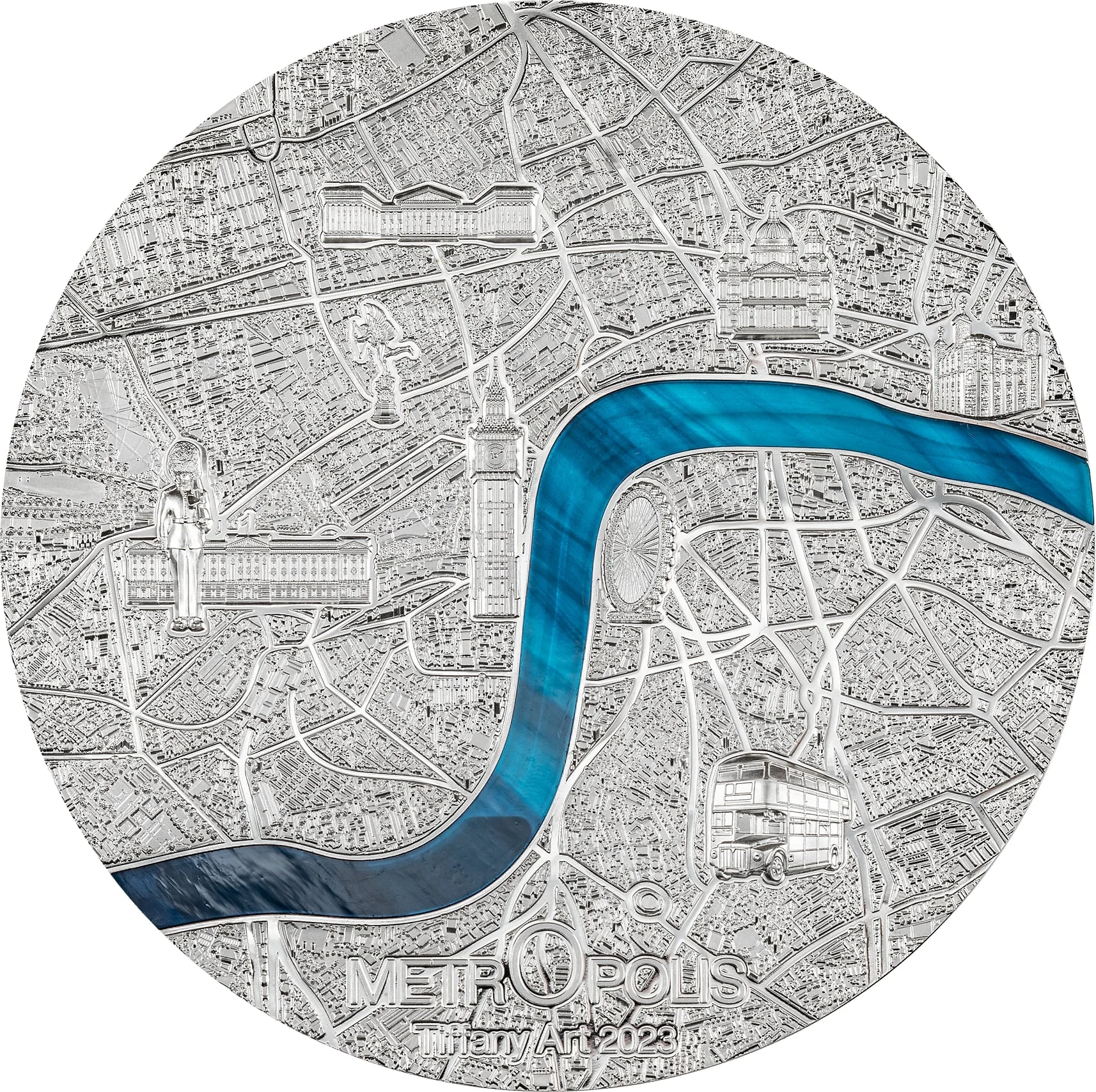 London's skyline featuring Buckingham Palace, Big Ben, the British Museum, the Tower of London, St. Paul’s Cathedral, and the Shaftesbury Memorial Fountain, with a blue glass Thames.