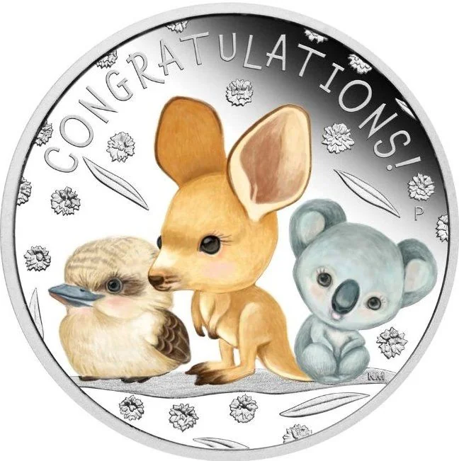 The design features a baby kookaburra, kangaroo, and koala with 'CONGRATULATIONS' and the Perth Mint's 'P' mintmark.