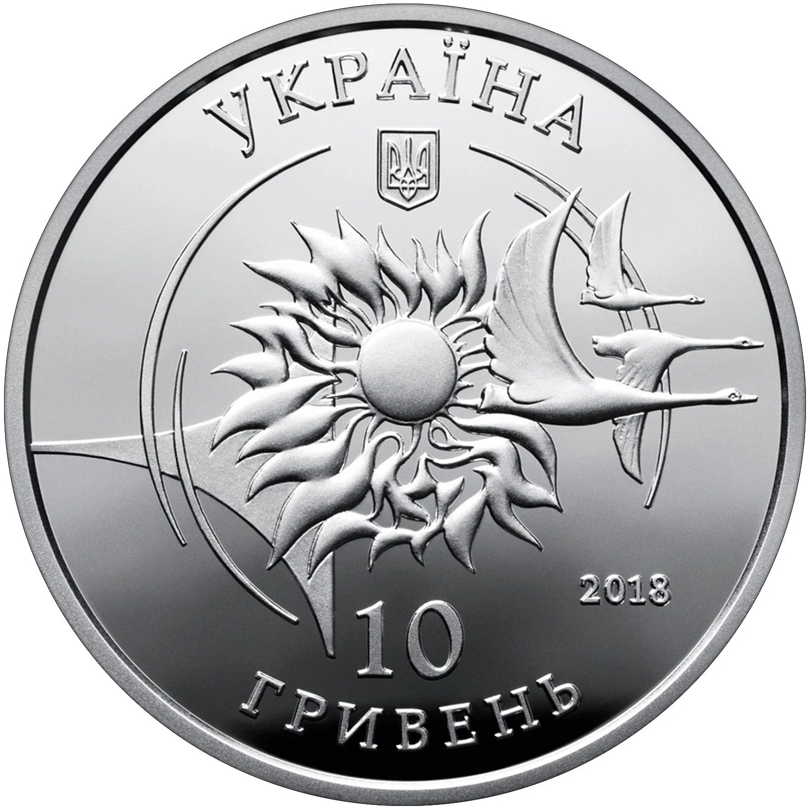 The design features the legend УКРАЇНА above Ukraine's small coat of arms. The central motif is a stylized sun, wing, and three birds, with the denomination 10 ГРИВЕНЬ and the year 2018 below.