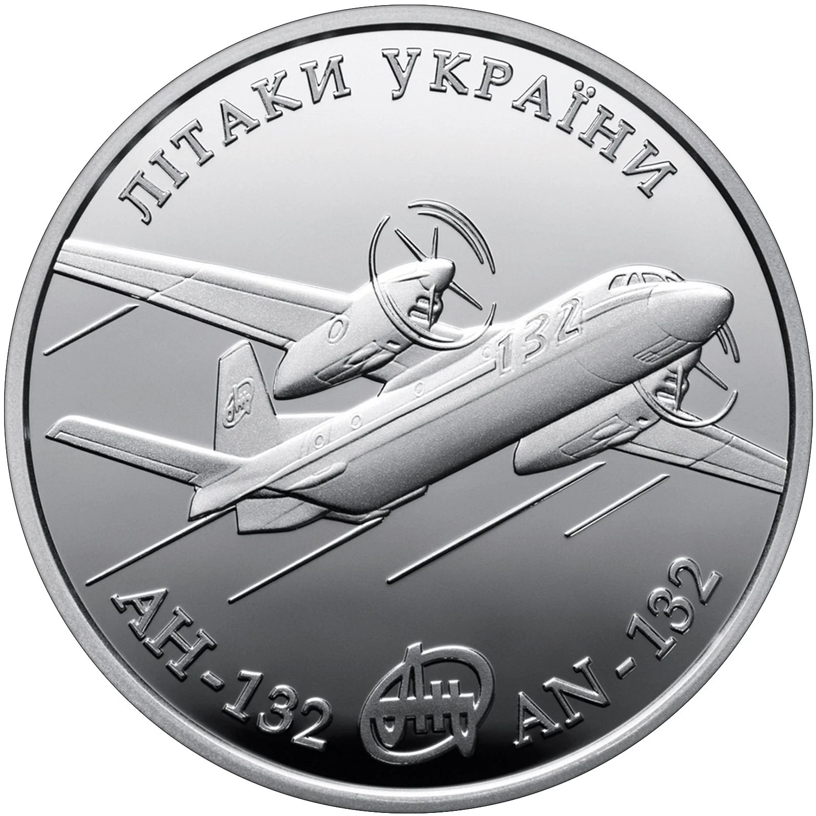 Centered on a smooth background is an image of the AN-132 with the text "ЛІТАКИ УКРАЇНИ" above and "АН-132, AN-132" below, flanking the AN logo.