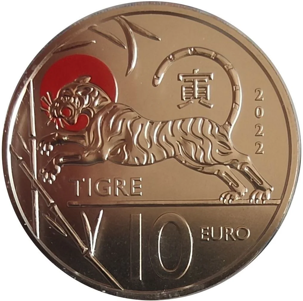 The Tiger, third sign of the Chinese zodiac, is centered with its snout encircled by a red sun. Flanking it are "TIGRE" and "2022"; the Chinese character for Tiger is top right, and "10 EURO" is centered at the bottom.