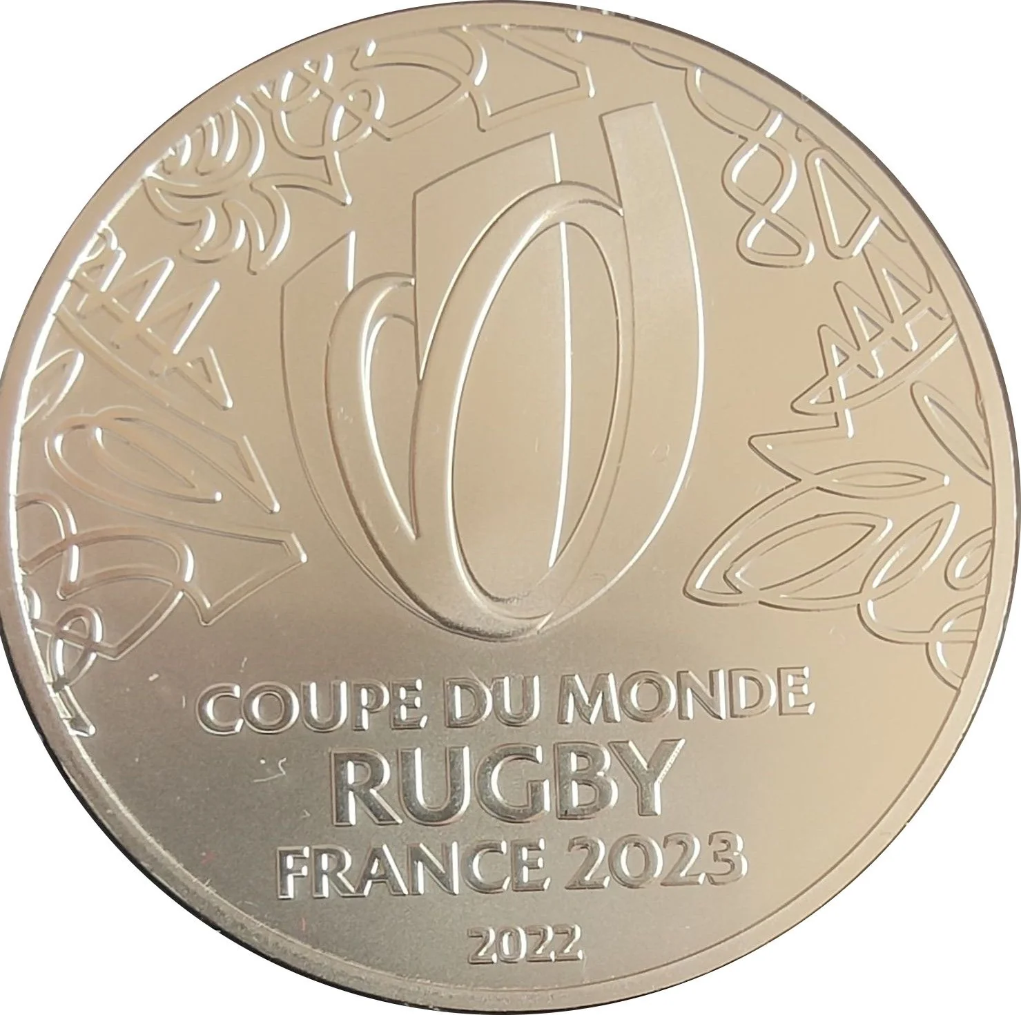 The Webb Ellis Cup, inscribed "RF" on the left and the face value on the right. Below is the Rugby World Cup logo, surrounded by the text "COUPE DU MONDE RUGBY FRANCE 2023".