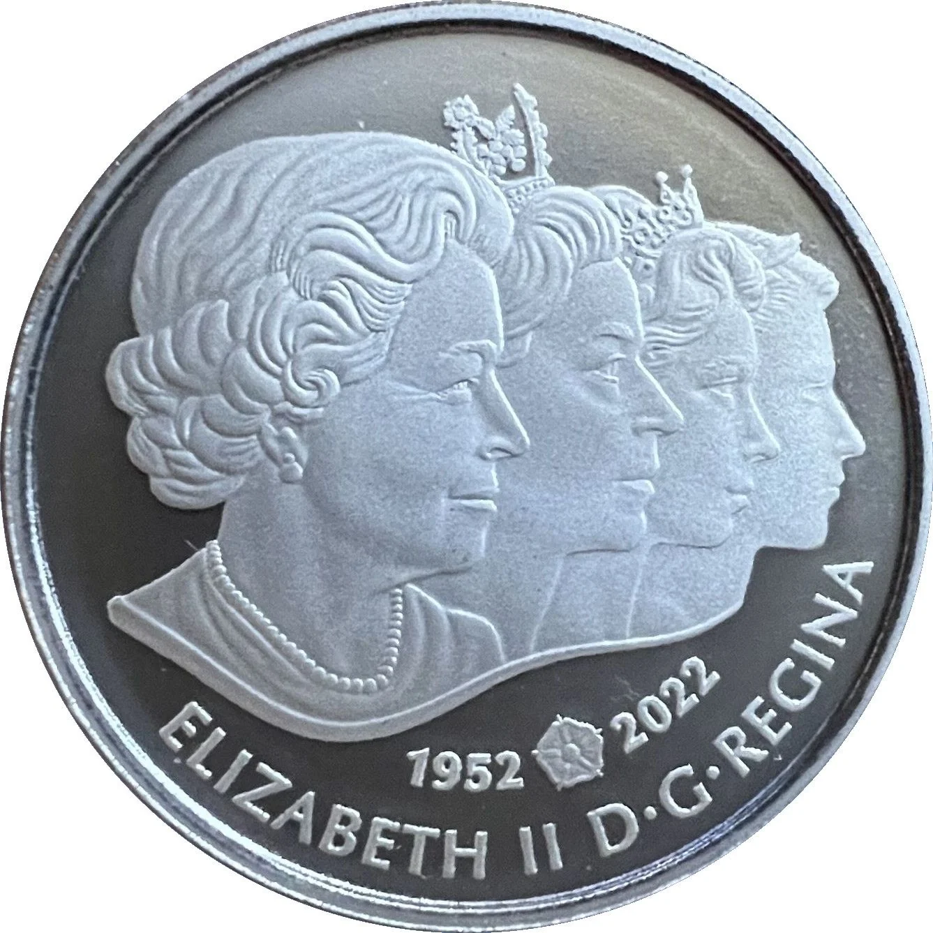 Four effigies of Queen Elizabeth on Canadian coins since 1953, facing right. Tudor rose between reign dates.