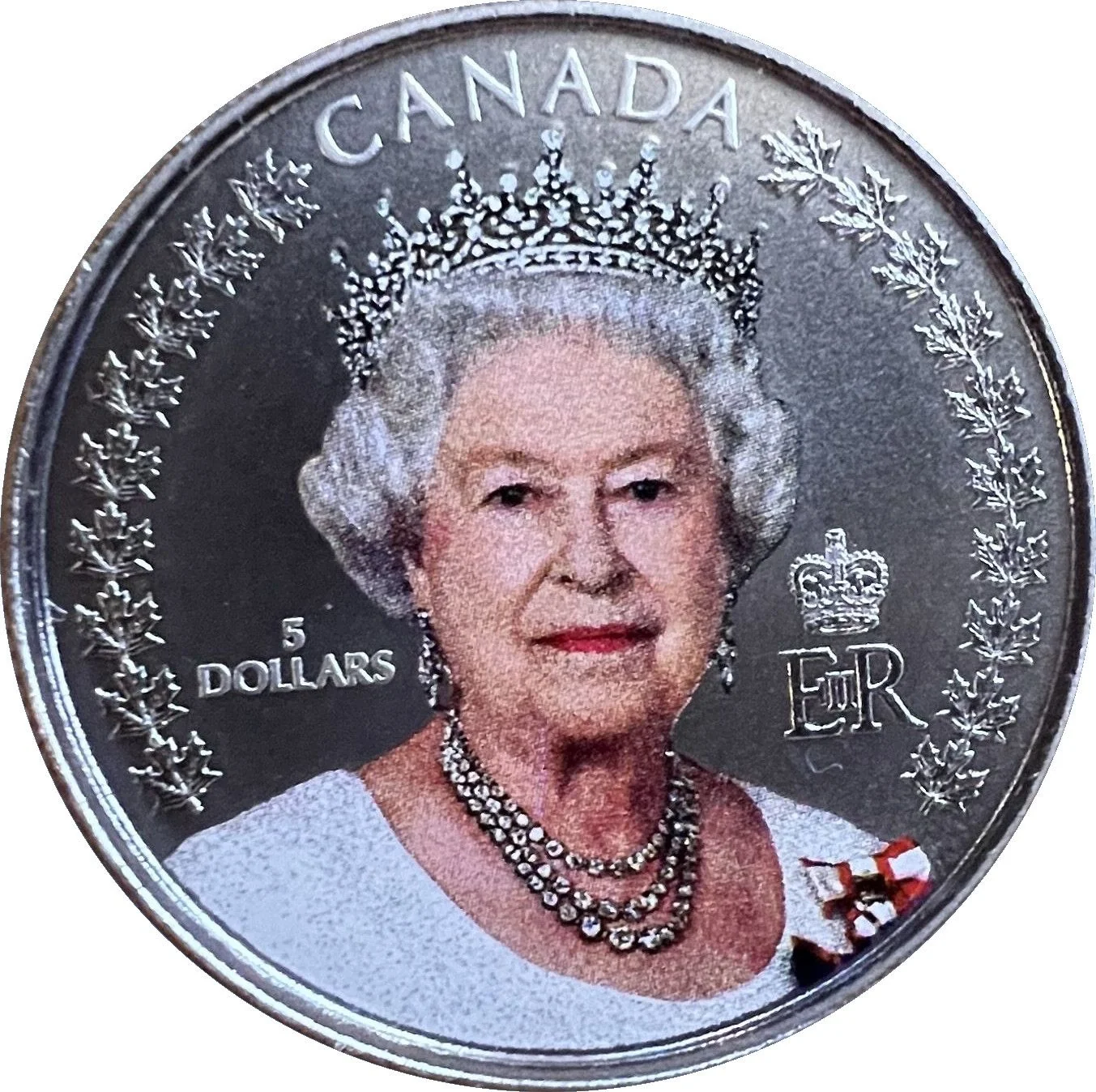 The reverse shows a cropped, color portrait of Queen Elizabeth II wearing Canadian orders, taken at Rideau Hall in 2010. It is paired with her Royal Cypher and surrounded by engraved maple leaves.