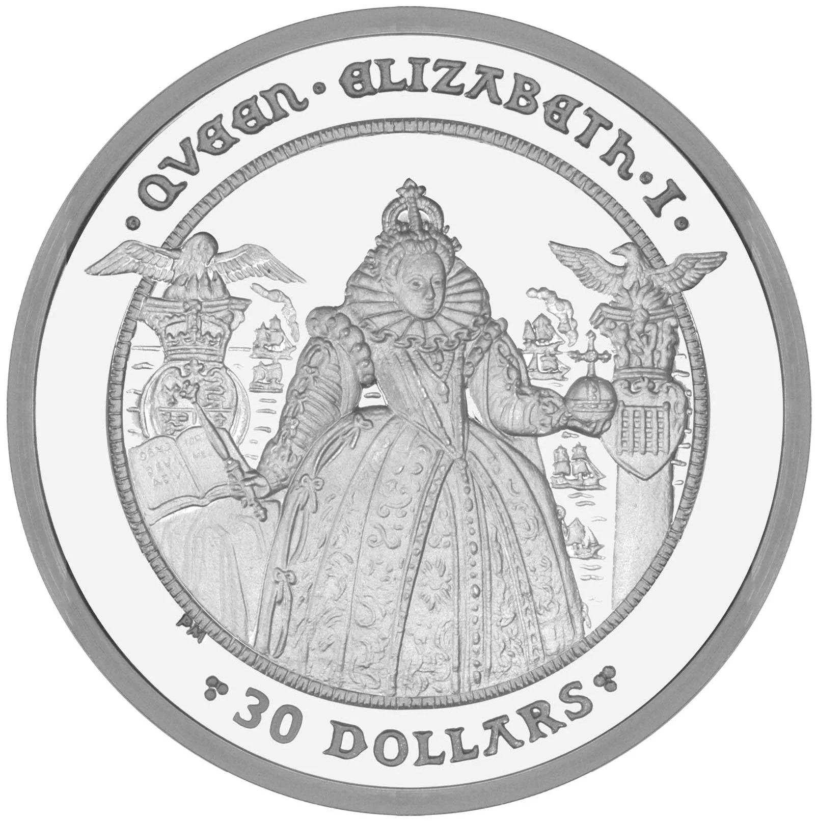 Queen Elizabeth I before totem poles, with Armada ships behind.