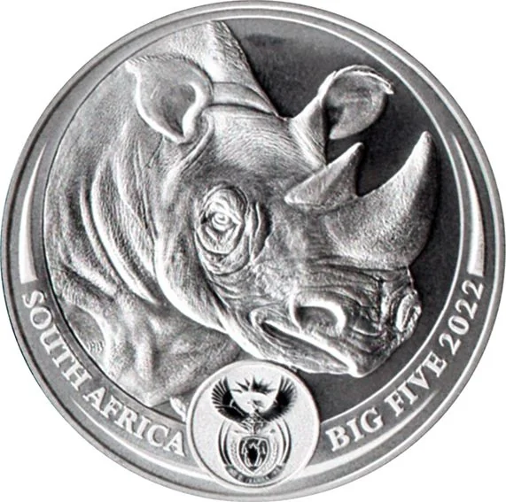 Black Rhino facing right, South African coat of arms below, text flanking the emblem.