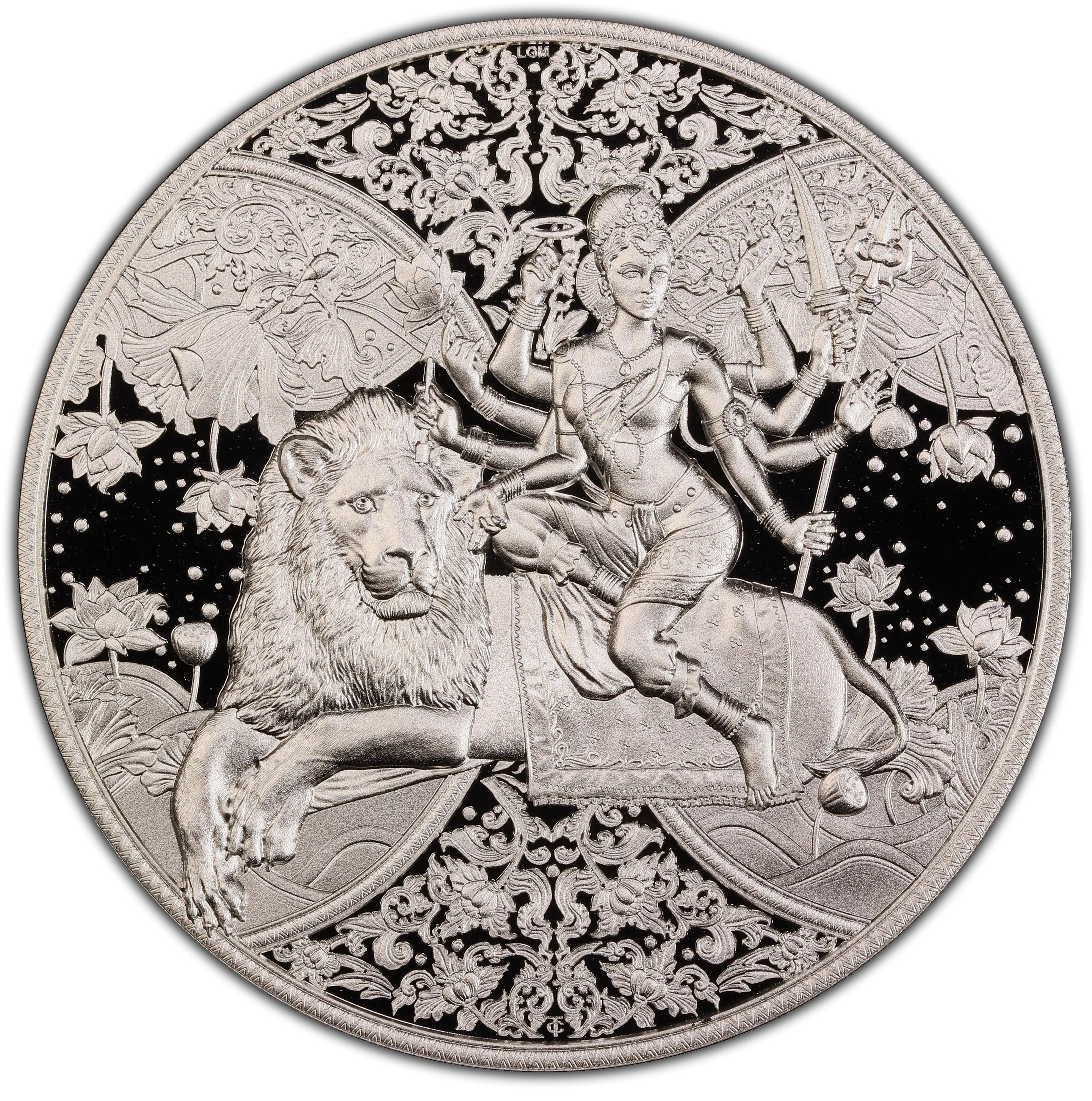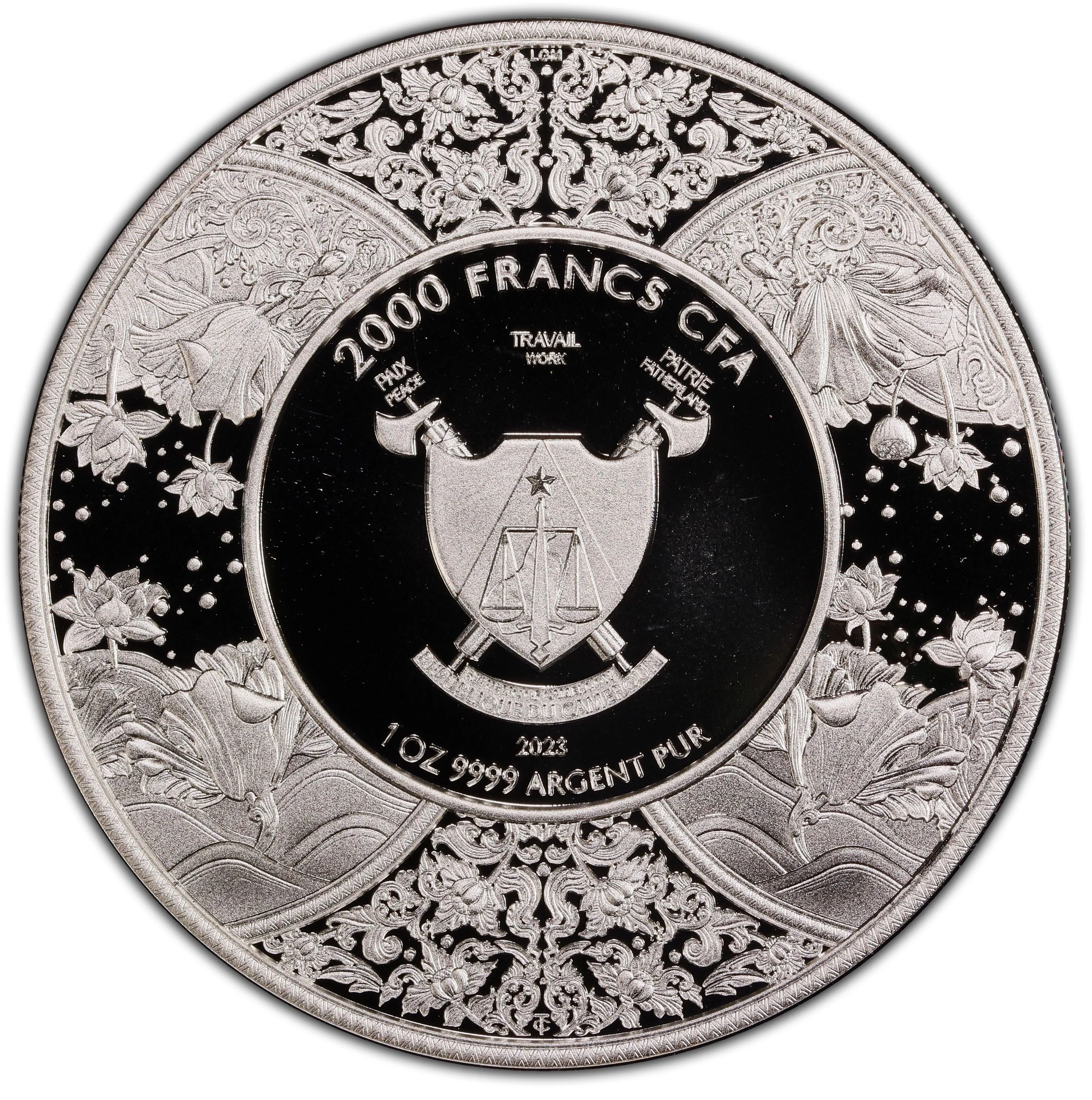 Description: Cameroon's coat of arms centered, surrounded by floral circles.