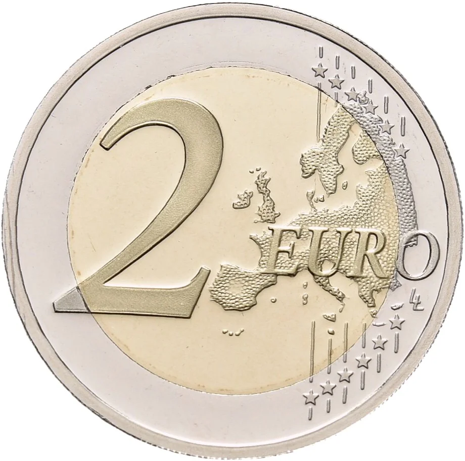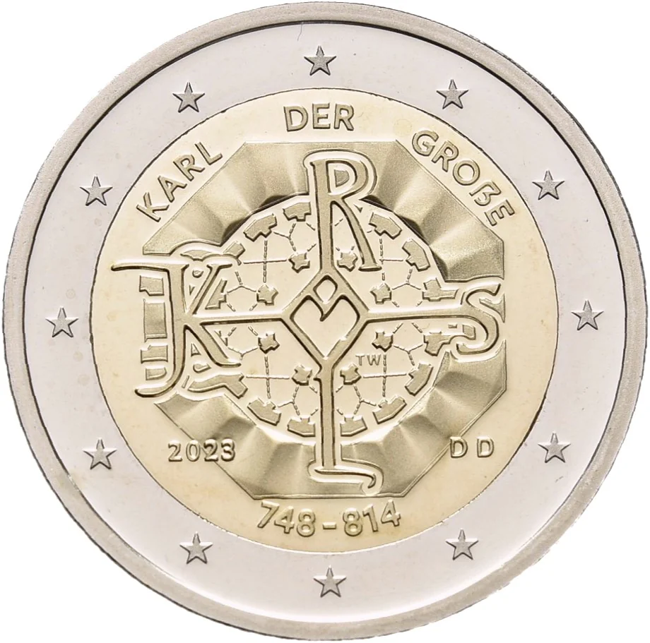 Description: Charlemagne's monogram over Aachen Cathedral's octagon is central. Above is "KARL DER GROẞE", below is "2023", to the right is the country code and mintmark ("D" followed by "A", "D", "F", "G", or "J"), and to the left is the artist's initials "TW". The outer ring features the twelve stars of the European Union.