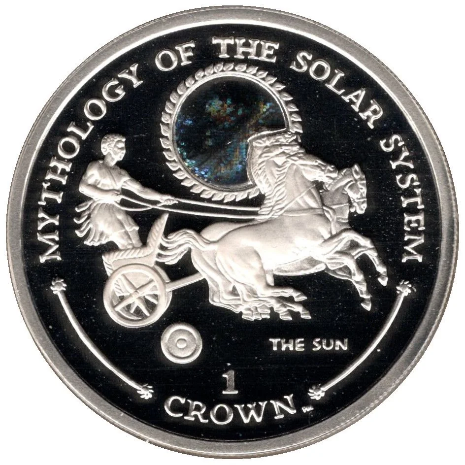 A sun design featuring Helios driving his four-horse chariot, with a hologram at its center.
