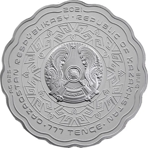 Description: Centrally, the State Emblem of Kazakhstan on an ornamental background is framed by the inscriptions QAZAQSTAN RESPÝBLIKASY ∙ REPUBLIC OF KAZAKHSTAN. Above is the year 2021; on the sides are the metal, fineness, and weight. Below is 777 TEŃGE.