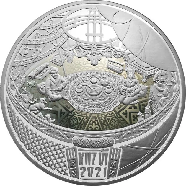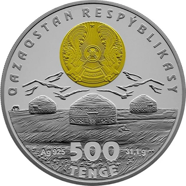 Description: The coin features Kazakhstan's State Emblem against stylized yurts and steppe. The top reads "QAZAQSTAN RESPÝBLIKASY," and the bottom shows the denomination "500 TEŃGE," along with the metal, fineness, and weight.