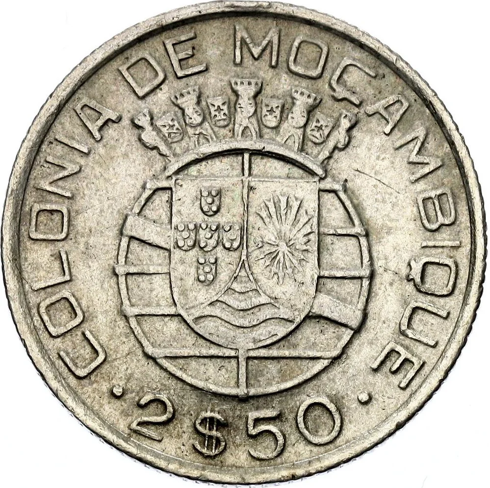 Portuguese Mozambique coat of arms within crowned armillary sphere, value below.