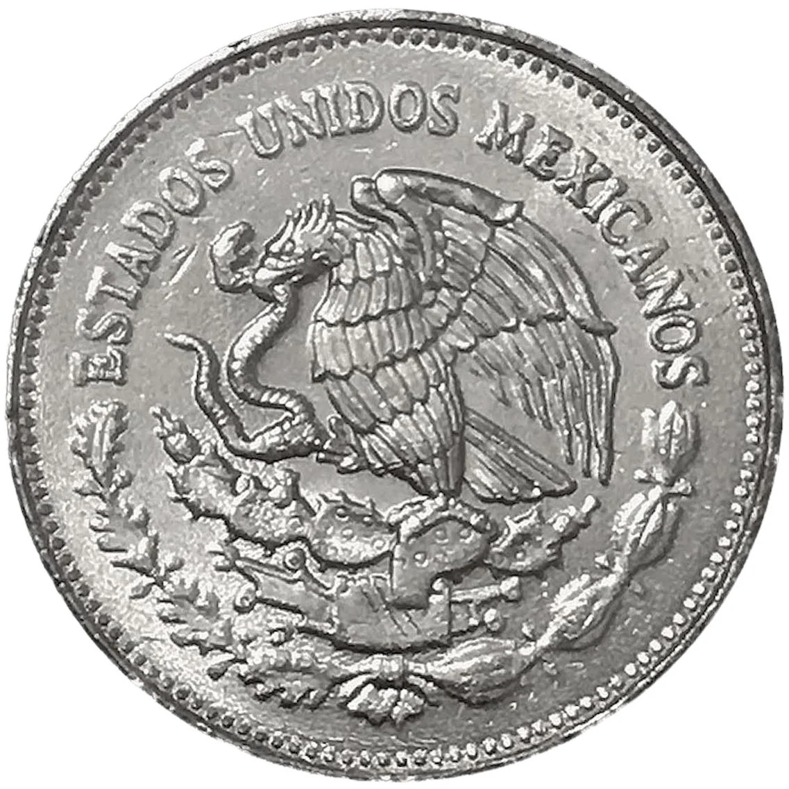 "Estados Unidos Mexicanos" arches above the Mexican coat of arms: a golden eagle perched on a cactus, devouring a snake, flanked by an oak branch and a laurel branch.