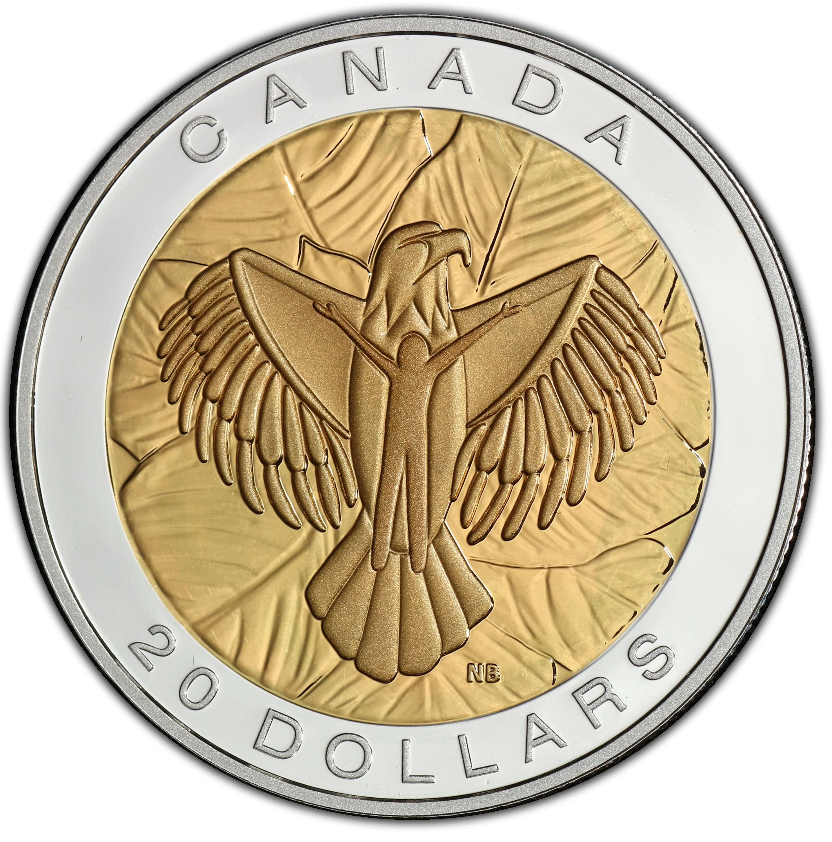 Designed by Métis artist Nathalie Bertin, this coin depicts an eagle in flight, its wings forming a heart as an abstract figure embraces its teachings. The background features a pattern of tobacco leaves.