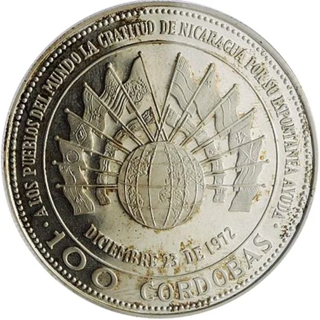 Inscription: A LOS PUEBLOS DEL MUNDO LA GRATITUD DE NICARAGUA POR SU ESPONTANEA AYUDA.