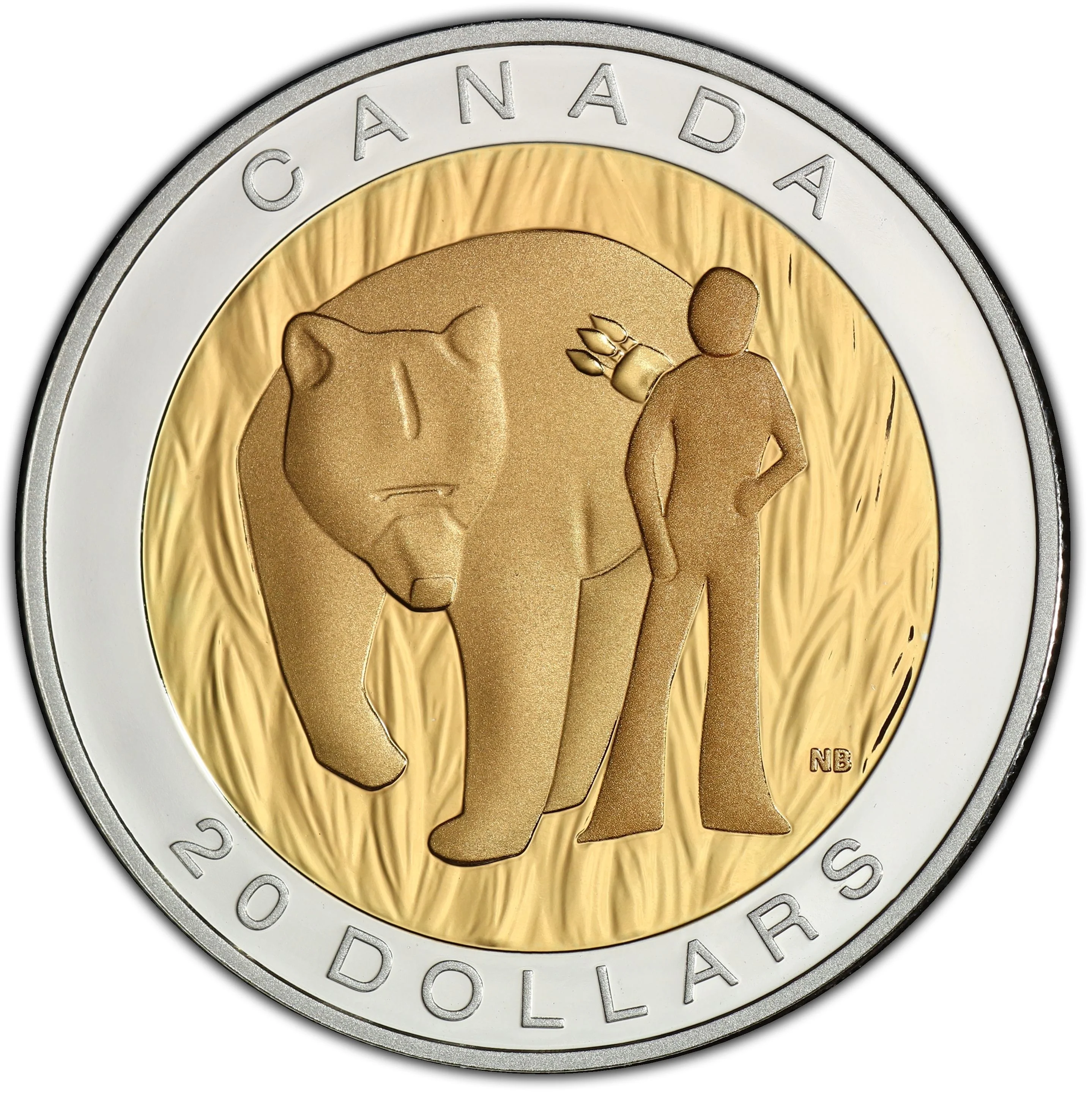 This coin, designed by Métis artist Nathalie Bertin, features a great bear standing behind an abstract warrior. The bear, a mentor and source of courage, lowers its head in quiet confidence. The background is patterned with braided sweetgrass, symbolizing the hair of Mother Earth and the bear's teachings.