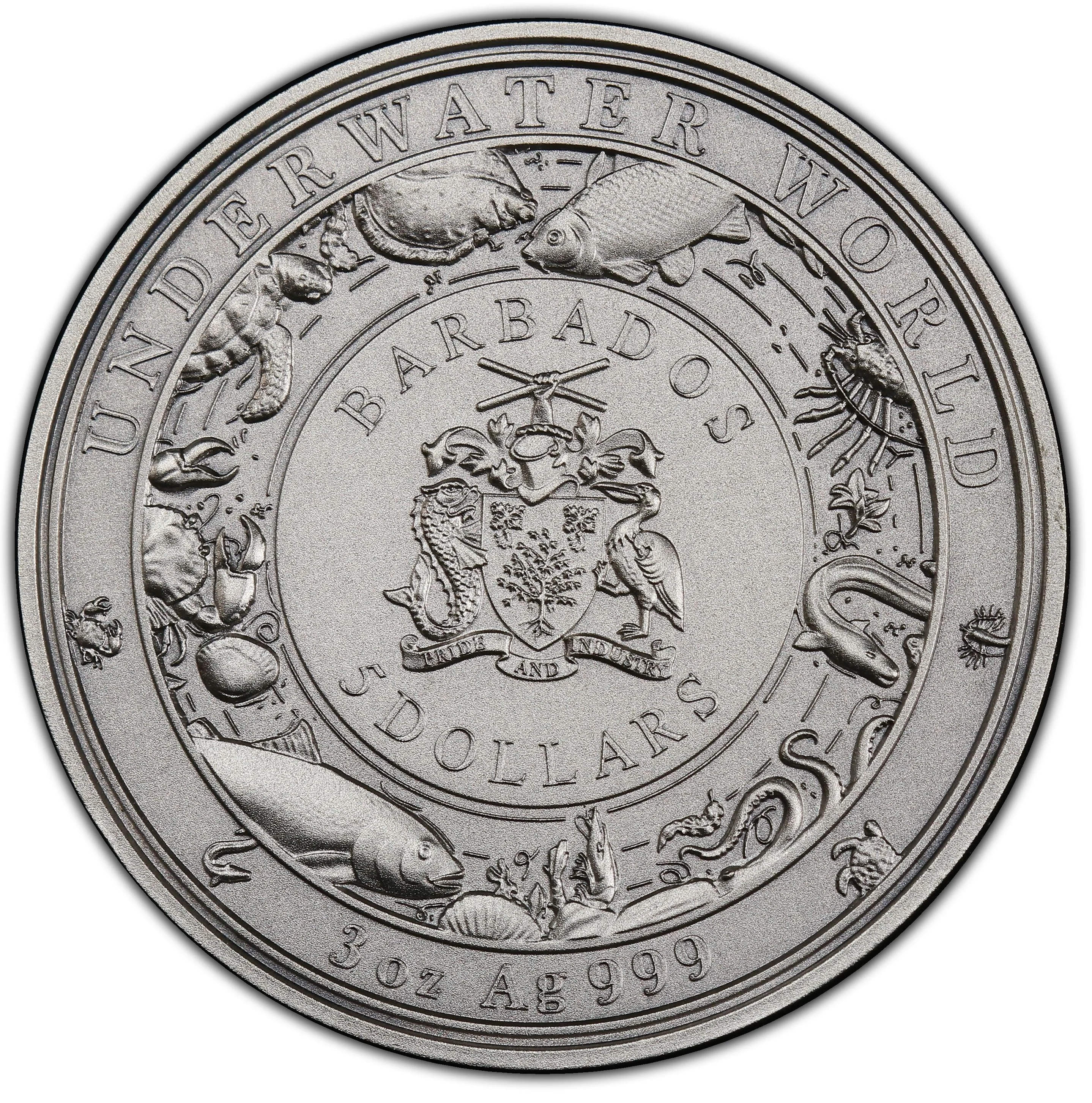 Underwater animals encircling a coat of arms.