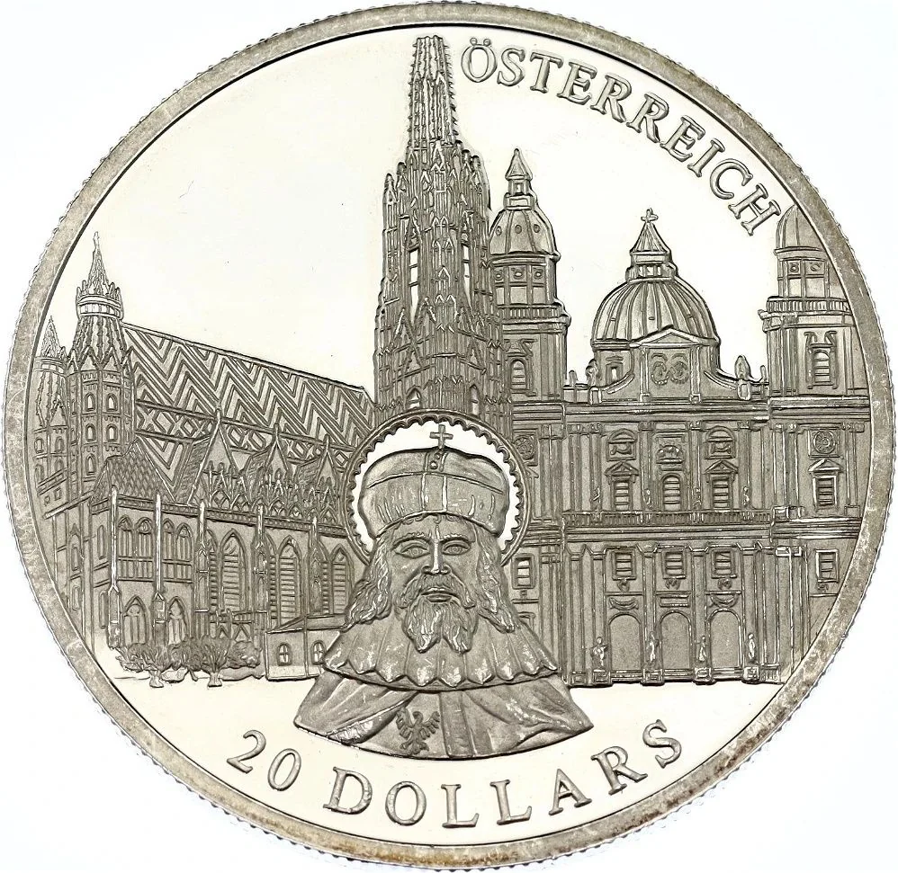 Leopold III, the Good, patron saint of Austria, with a religious building behind him.
