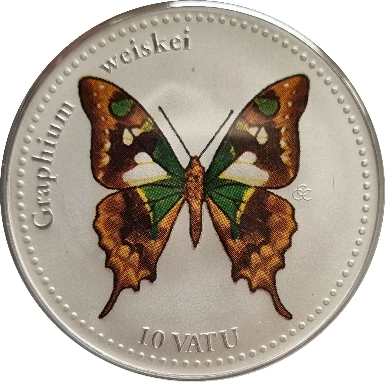 Vanuatu's arms depict a Melanesian warrior before a curved boar's tooth, a scroll reading "LONG GOD YUMI STANAP," and the date.
