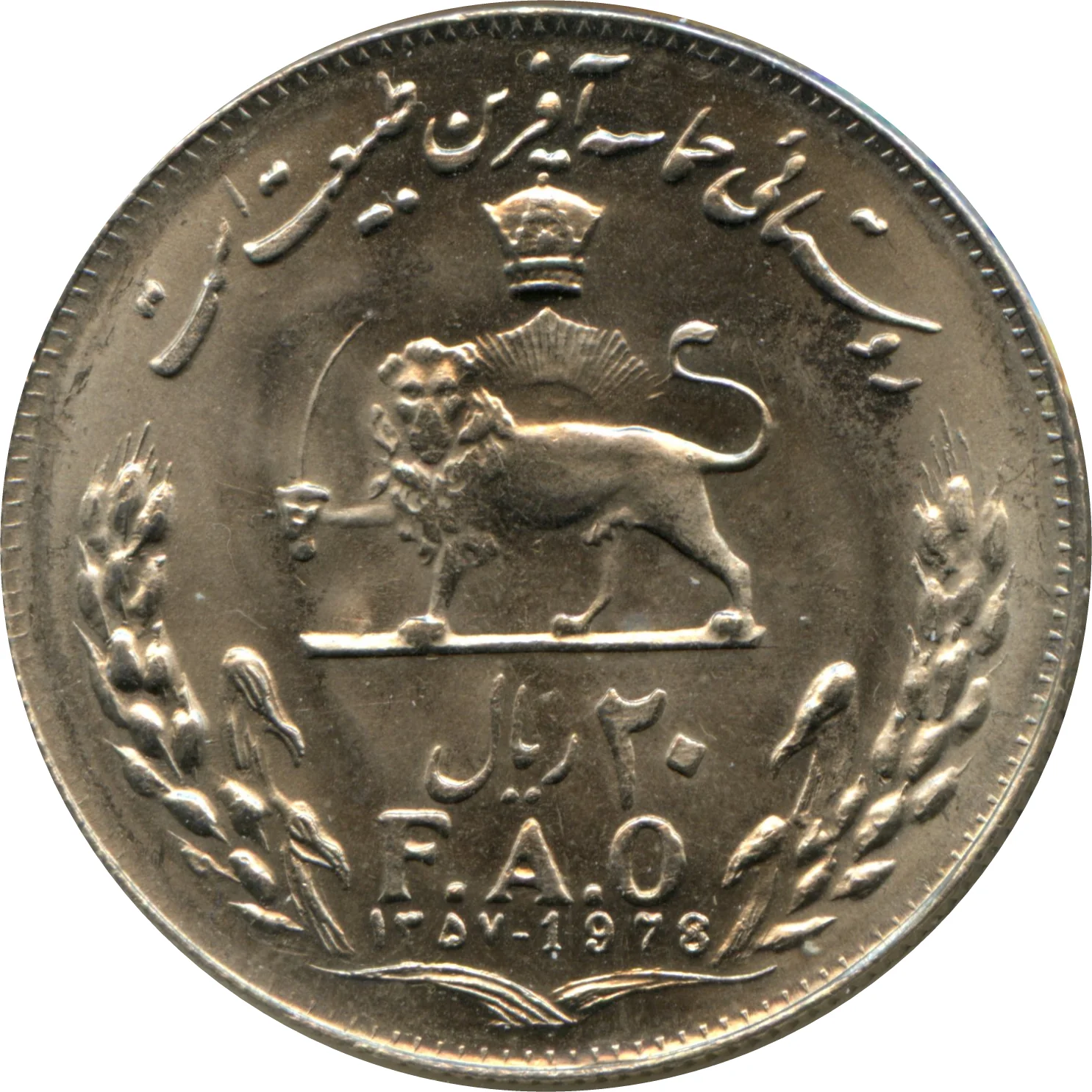 Pahlavi crown, lion and sun, wheat spikes. Legend: "The villager is the epic constructor of Nature." 20 RIALS, F.A.O., with Persian and Gregorian dates.