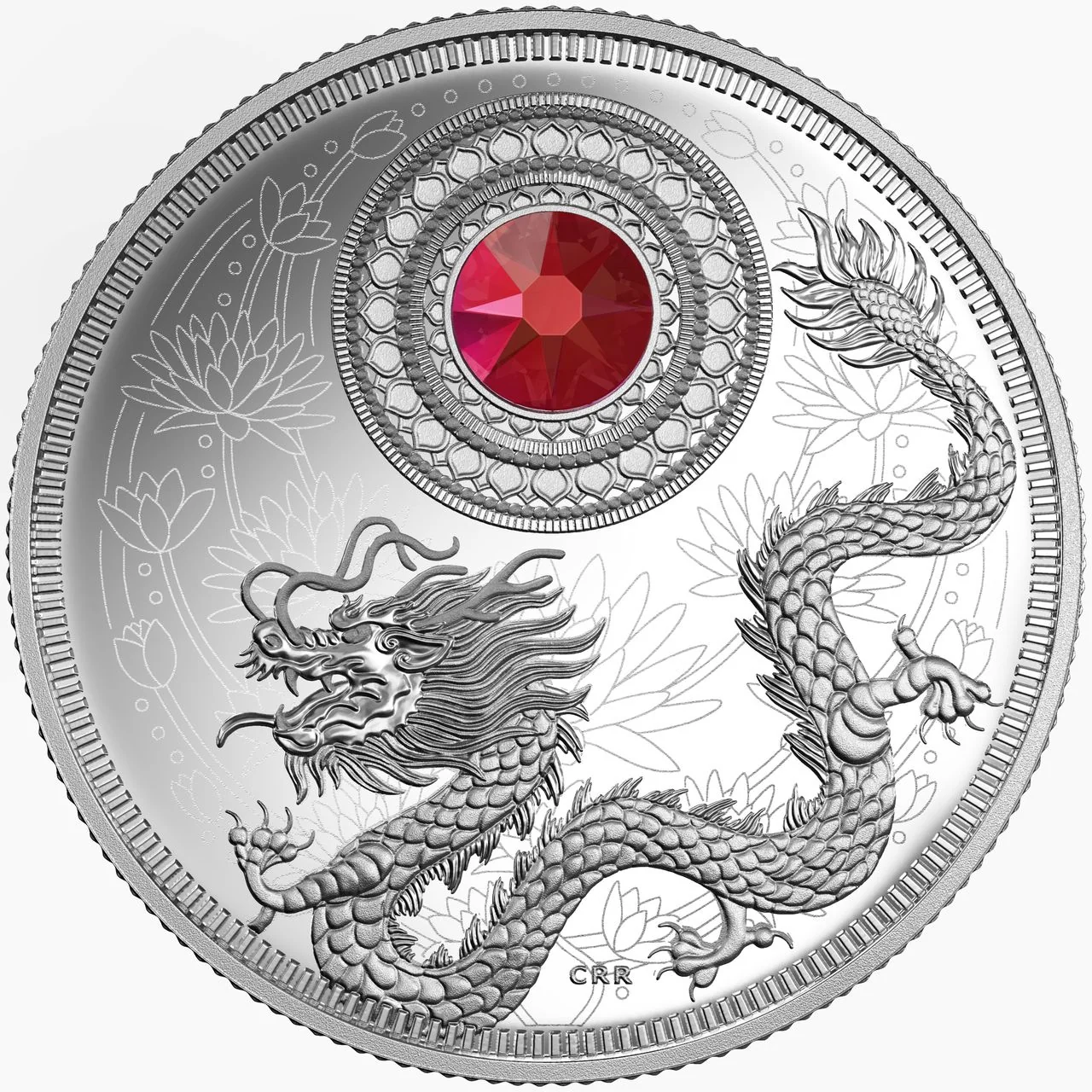 Lotus-patterned background with a Swarovski crystal above a dragon.