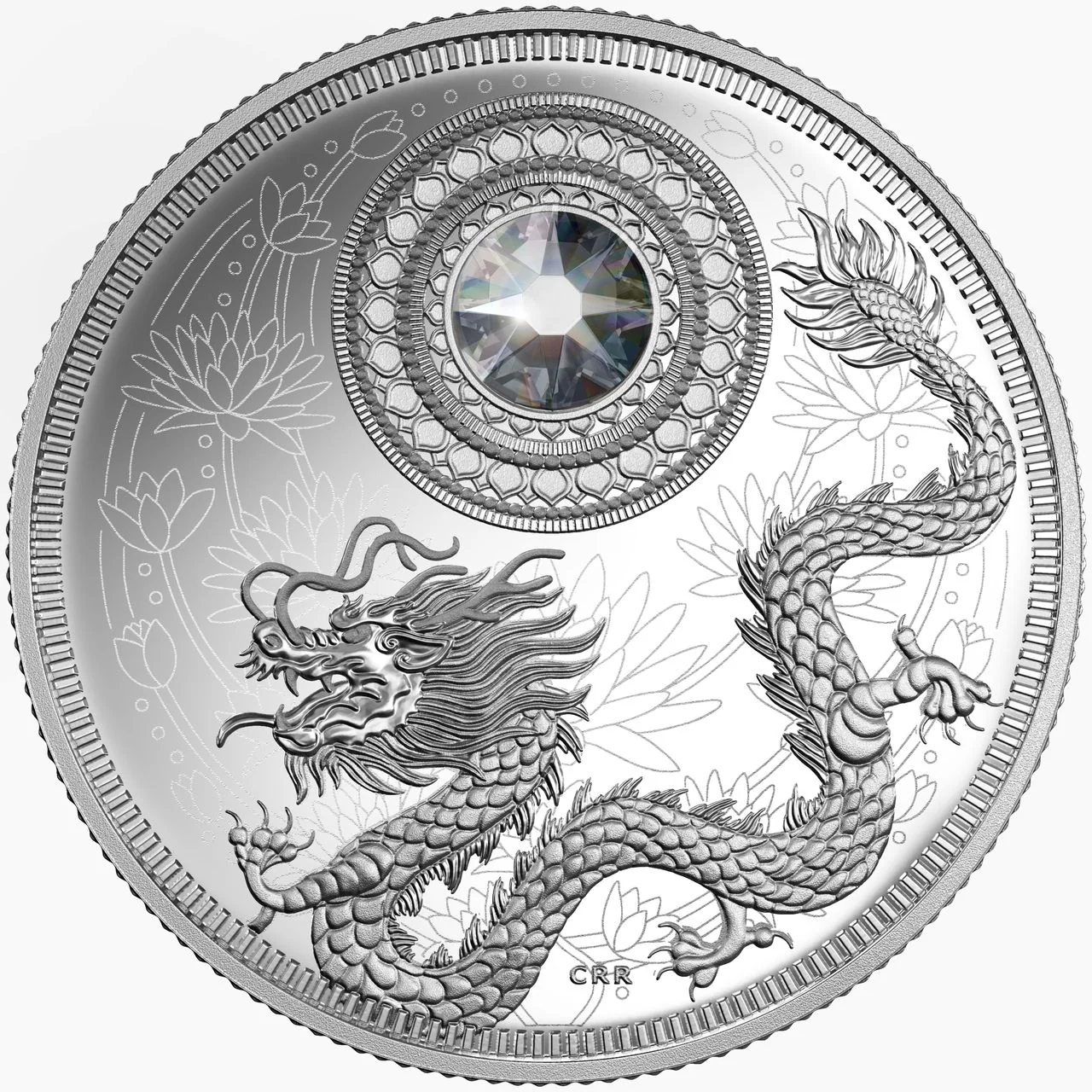 Lotus-patterned background with a Swarovski crystal above a dragon.