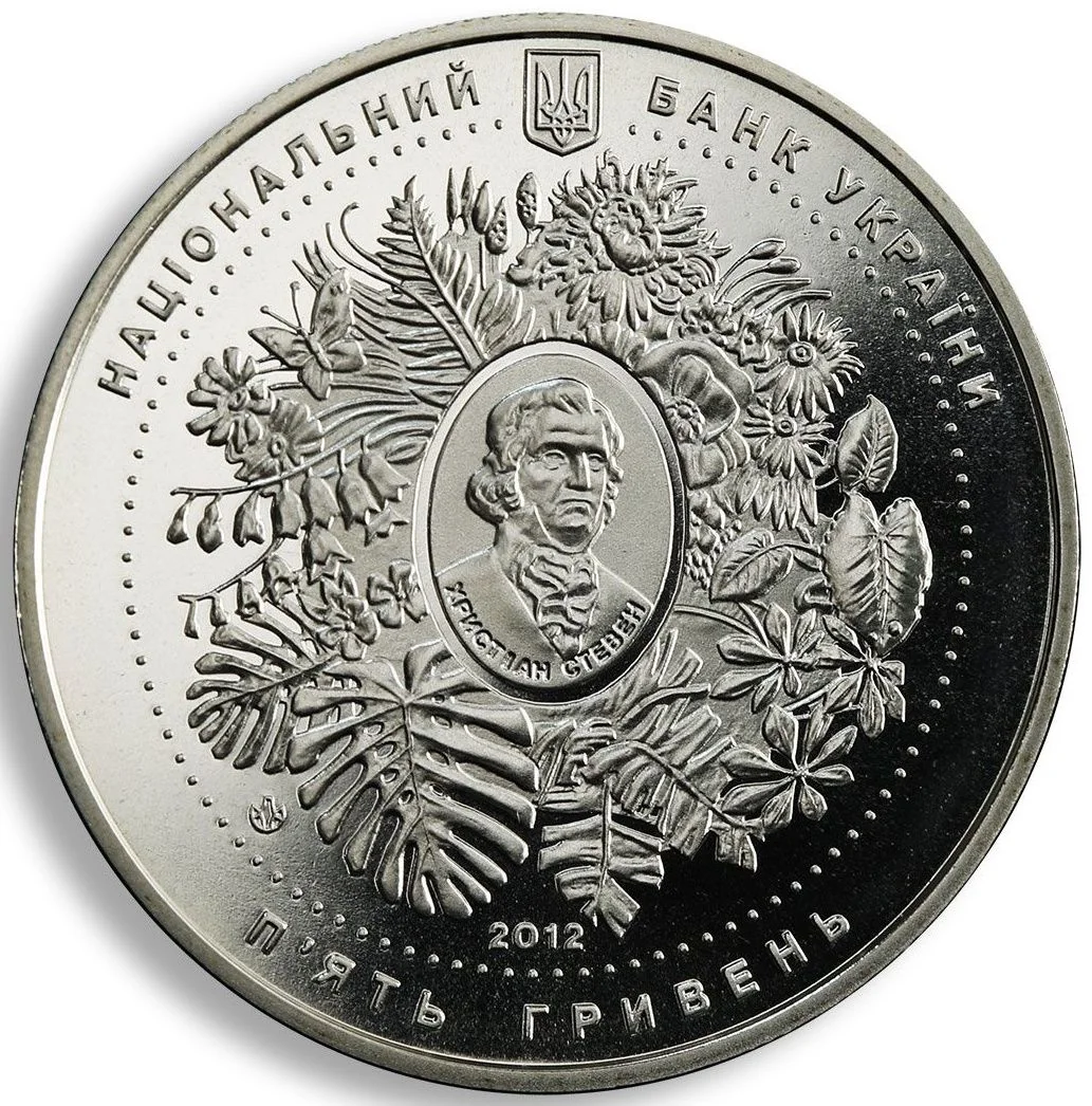 The obverse features the Small Coat of Arms of Ukraine with the inscription "НАЦІОНАЛЬНИЙ БАНК УКРАЇНИ". Centered is a portrait bust of Christian Steven, the garden's founder and first director, with his name inscribed. Below are the year 2012 and the crescent-like legend "П'ЯТЬ ГРИВЕНЬ", with the Mint logo to the left on the white copper coin.