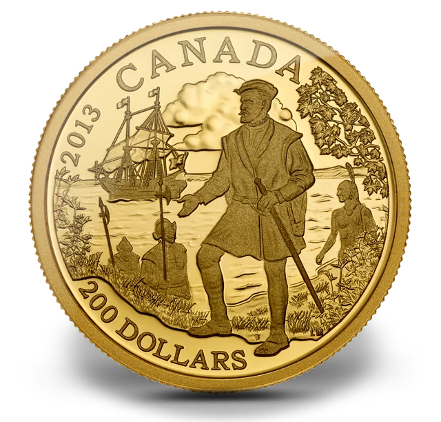Designed by Laurie McGaw, this coin features Jacques Cartier surveying the land, accompanied by soldiers and a guide. It is engraved with "CANADA," "2013," and "200 DOLLARS."