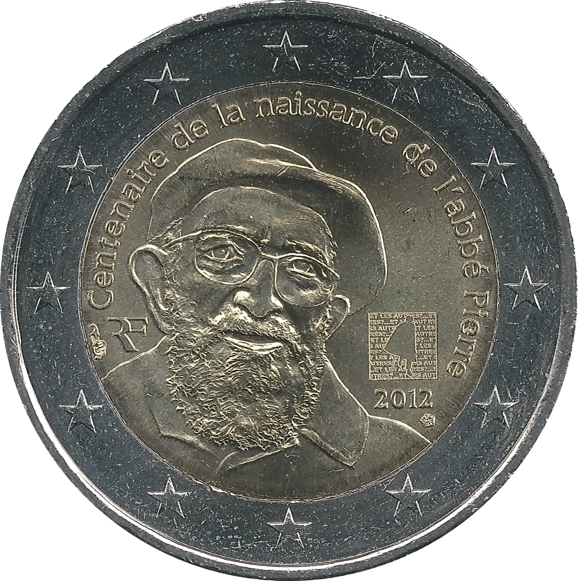 The inner part features a left-offset portrait of Abbé Pierre in his beret, with his foundation's logo and micro-lettered motto "Et les autres?" to the right. An arching inscription "Centenaire de la naissance de l’abbé Pierre" surrounds the portrait, flanked by the mintmark, "RF," and the engraver's hallmark. The outer ring displays the 12 stars of the EU.
