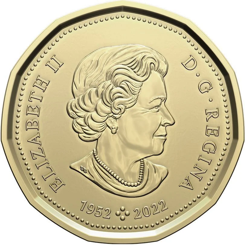 Queen Elizabeth II at 77, facing right, wearing a necklace and earrings. The effigy includes the dates 1952–2022 separated by four pearls, representing her four portraits on Canadian coins.