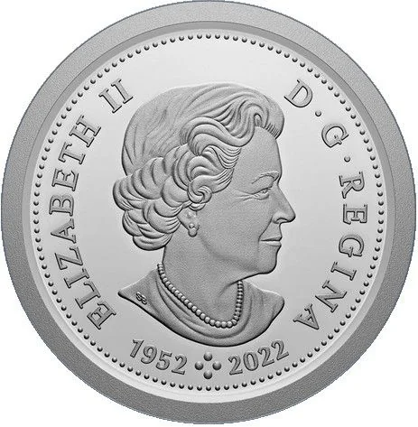 Queen Elizabeth II at 77, facing right, wearing a necklace and earrings. The effigy includes the dates 1952–2022 separated by four pearls, representing her four portraits on Canadian coins.