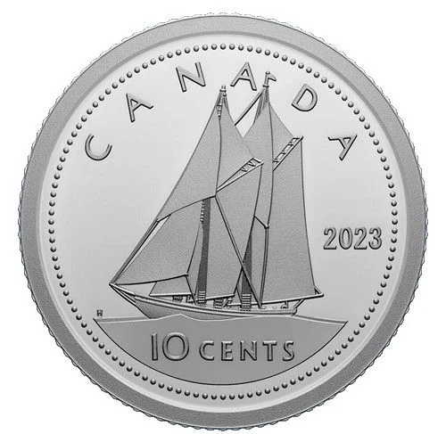 The Bluenose, a celebrated Canadian schooner and symbol of Nova Scotia, under sail with its face value and "CANADA."