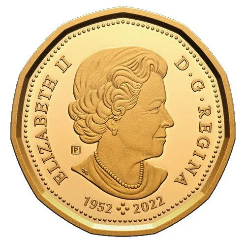 Queen Elizabeth II at 77, facing right, wearing a necklace and earrings. The effigy includes the dates 1952–2022 separated by four pearls, representing her four portraits on Canadian coins.