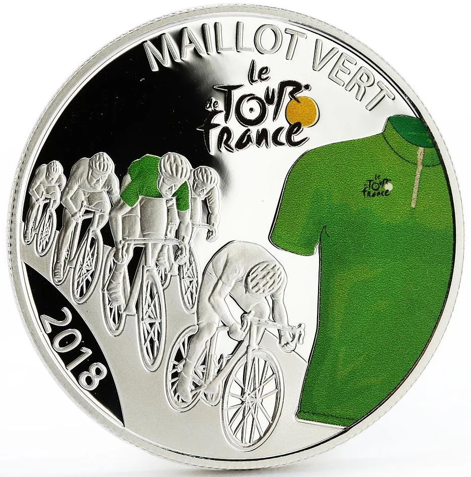 Cyclists on a road, one in a green jersey on the right. Date at lower left.