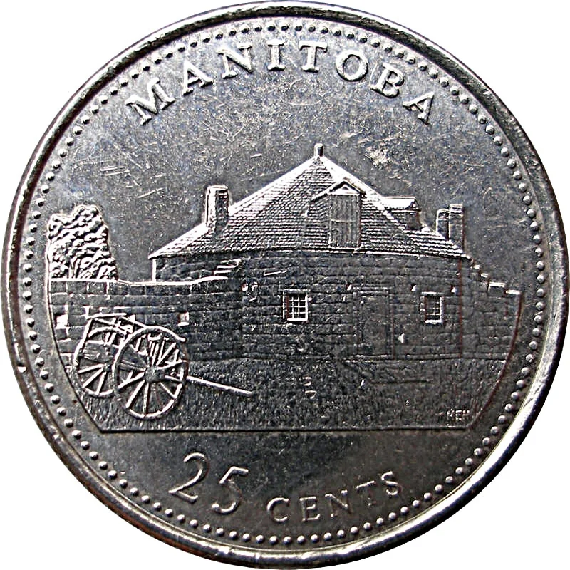 Manitoba's design features the Southwest Bastion of Lower Fort Garry, encircled by its face value and the bilingual name "MANITOBA."