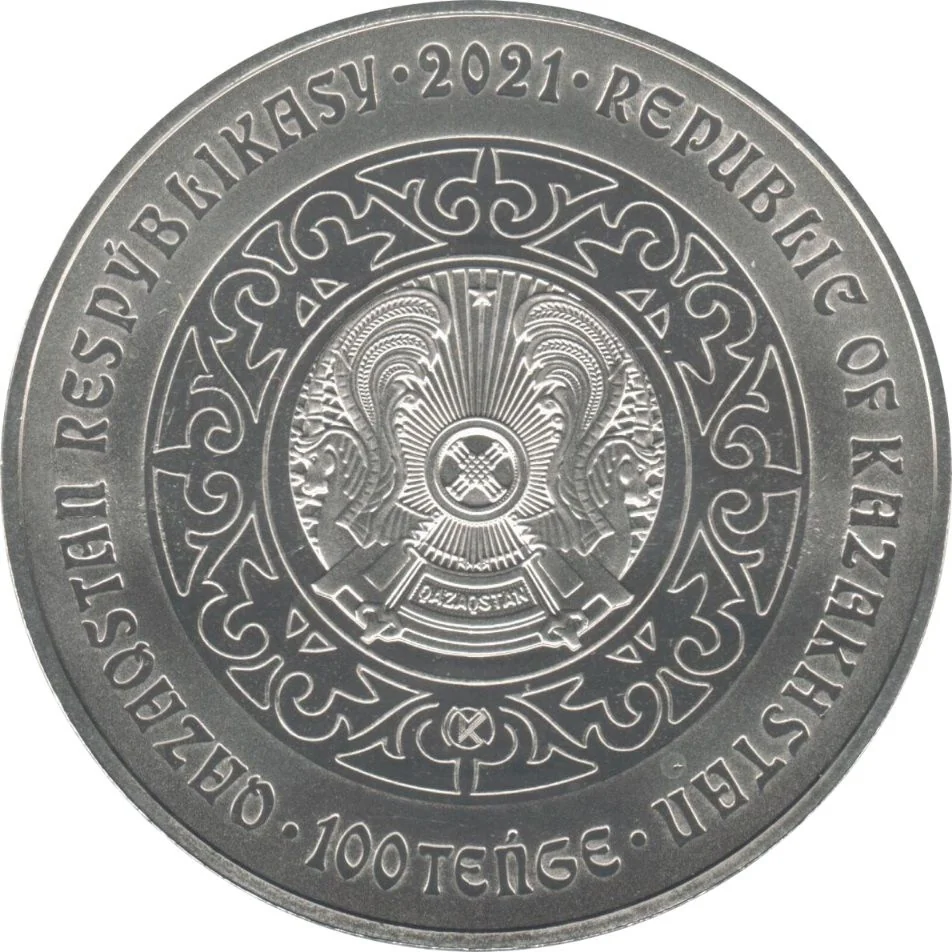 Description: Centered within a national ornament are the Kazakhstan coat of arms and Mint trademark. The circumference bears the inscriptions "QAZAQSTAN RESPÝBLIKASY" and "REPUBLIC OF KAZAKHSTAN". "2021" is at the top, and the denomination "100 TEŃGE" is at the bottom.