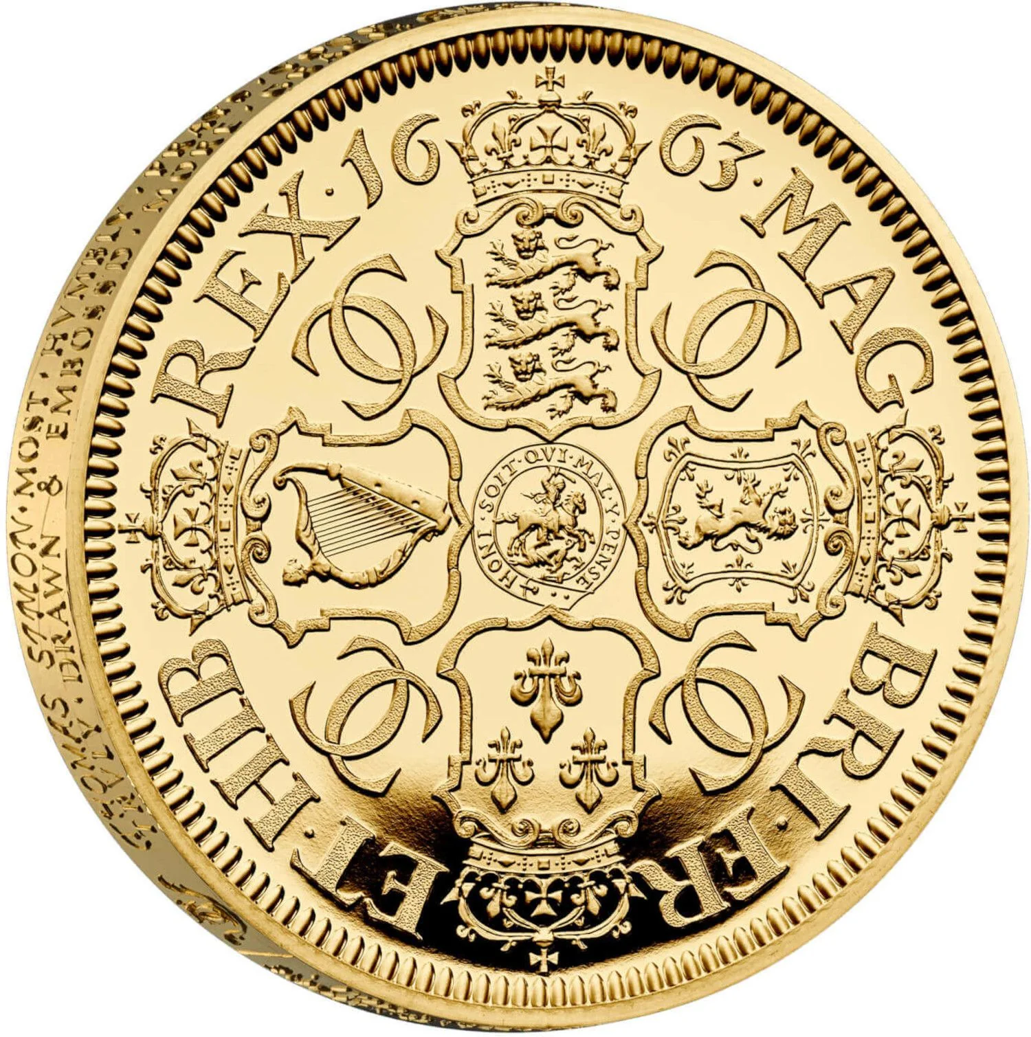 Crowned shields of England, Scotland, Ireland, and France with interlinked C's, date above, legend around.