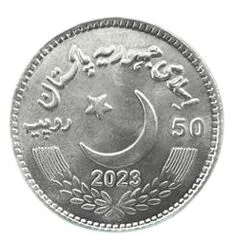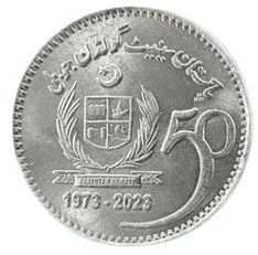 Description: The coin's reverse features the Senate of Pakistan insignia, with the numeral "50" to its right. Above the insignia, "Pakistan Senate Golden Jubilee" is inscribed in Urdu, and the years "1973-2023" are written below it.