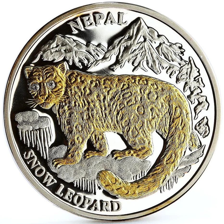Gilt snow leopard looking back with diamond eyes.