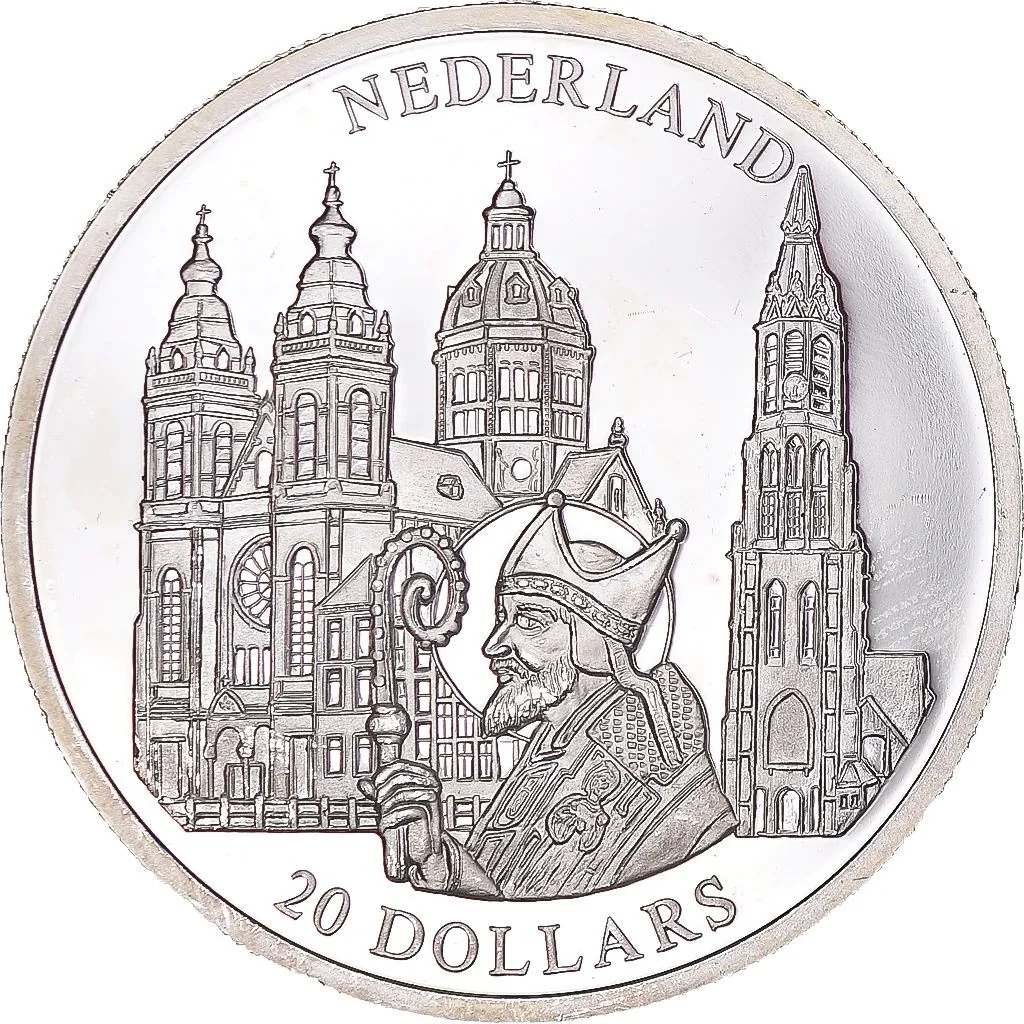 Saint Nicholas with the Basilica of Saint Nicholas in Amsterdam and the Nieuwe Kerk in Delft behind him.