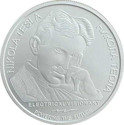 Description: Centered Serbian coat of arms above stylized text of Tesla's quotes on energy, frequency, vibration, and the numbers 3, 6, and 9.